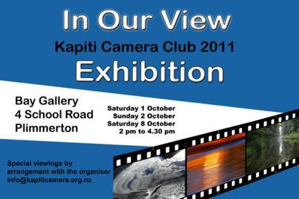 Our camera club friends to the south – the Kapiti Camera Club (for Porirua and surrounding areas) – are holding an exhibition on 1, 2 and 8 October 2011 in Plimmerton. See details in the flyer.